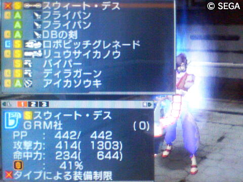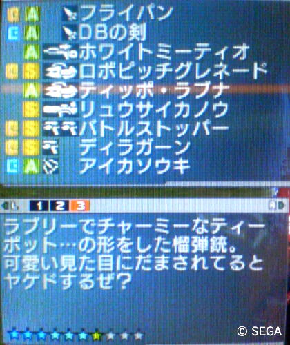 てかこんな妙なグレネードひろたー。 模様違いで3種有るらしい“ティッポ”(=ティーポット)シリーズだって。 でもロボピッチャのほうが俄然強いからつかいません。 セガセガうるさいけどwオンラインのとちがって微妙に音程変わるけどww あとやっと出た甘食、じゃない甘死。 これはファイター系職(リーダ)じゃないと出ないんかな?? ラッピーもPSPoはかなりでやすいよなーやっぱ。 撮影中、牽制してくれてるのは4方向射(5だっけ?)のしゃどーぐ。 しかし、 ……あさくらぁぁ!!!(ケイゾク風に詠んでね) おーこのツインセイバー用PA探してたんだよー! でもヒカイシュウハザン(ダガー用)出ないなー。もう泥率的に駄目かなぁ? S槍なんかも出たけど、属性が…… ……悔しいです!! マルチにしかない「真影に至る闇」もやってなかったー。短いからいいけど。 敵はキツめだったorz ヘッドスロなし鎧とか~(よろいじゃない防具w) 鞭のなかなか属性とか(鞭そんな使わんけどさ) あと、これははじめての出土だった、ぶらっくばるず~。 でもこれもなんか他のものでより強いの有った気が。 まーとりあえずこれでライフル収集率も80%到達ー!(報酬:キラーエリート) 真影が埋まったのでコロニー発ミッション踏破も完了ー。(報酬なんか忘れた) あ、真影はマルチで結構やってたので。いってなかったS一回で終わりました。 マルチの“アルテラツゴォォォグ!”のあと箱からはミクミコ服。 「獣と機械の狂乱」に3回かな?とか行って、2着ひろって、 着てないけど緑/青と黄/橙だったです。 しかし服って倉庫圧迫する……捨てたら2度と出ないかもしれないしorz (売ってる服でも一回買ったのは処分しづらいしなー) PR Designed by まめの (Customized by Lost R) Copyright © [ るまぶろげーとZ ] All Rights Reserved. http://ruma.blog.shinobi.jp/ |