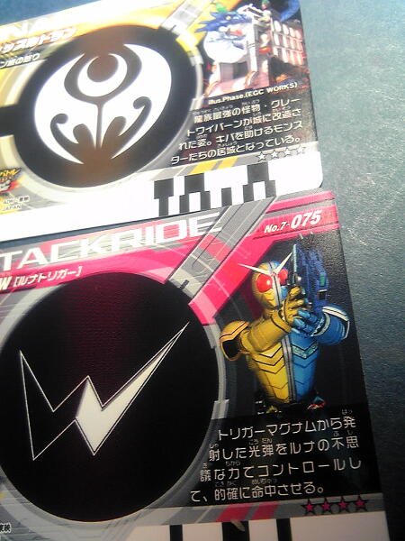 そういえばこの7弾からナレーターがWのメモリボイスの人になったんだった。 本日最初にSPSRのキャッスルドラーーンが出てしまったのが運の尽き的な。 夜で子供居ないし、ついついやってしまい気づけばキャンペーン版が初めて一枚! 星のトコ撮りたいばっかりにスキル写してないや。 「咆哮!月光の撃鉄:チームタイリョク+100アタックポイント+10」 ついでに光って見えづらい城竜は 「ドラゴン城の怒り:キャッスルドランの攻撃であいてにダメージを与える。 さらに、2ラウンドのあいだ、相手のボウギョ-300」 4弾だかのFARキャンペーンカードみたいなかんじ。 Wホロキラキャンペーンのカードは排出率がそれに準じてるみたいだけどね。 FARはSPの続きだったから違和感なかったけど、 今回もカードの番号がSPの後の70番台とかになってて、 たとえ7弾が後に再出荷されてもホロキラ9種は収録されないようになってるようで。 本日の捕獲分。 逆位置の一枚はカードの意味が反対に……ではなく単なるダブり。(7弾初) ちなみに何回やったのかなー?……数えるなよ! (見てすぐ把握しやすい切りのいい数だけどさ) シャドムンさんがNとR一枚づつでましたね、でもよわいです。 Nのほうのスキルとか相手がブラックの時に限定発動とかだし……。 (これってブラックRXは含まないんだろうな) そういえば今日は6回くらい“難しい”で勝って、 (他一回試しに“簡単”とかもやったりw最後1枚はカード買うだったし) そのうち4回EXにいって、(こっちはシャドムン+DCDCMPなんだけど) なおかつ、うち2回はスーパー?EXかなんかわすれたけど(わすれんなよ)、 前衛クウガライジングアルティメット"ブラックアイ"+後衛双剣シャドムン、とかだった。 ……って黒目て!必殺威力4400とかて!おにか!あくまか!クウガバ!! まーそれには勝つどころか一回はファイナル前に「普通に撲殺」されたりorz 前座“難しい”を2Rdまでに敵ボッコボコにして、 敵はゲージたりない3Rd目、こっち必殺は出さずゲージ温存していったのに、 見事でたExの1Rdで当然のように敵がゲキレツかましてきて手が出せず、 2rd目はスロット負けで溜まりに溜まった200%ゲージでW必殺だしたいのに、 普通にスロ負けで先手取られそこで死んだような気がする……。 だけど、ただのEXのほうは一回だけファイナルラウンドで勝ったぜ!(要するにスロット出目勝ちね) ライアル黒目には永遠に勝てそうにない気がするよ……。 今回やったの全部、日曜“キ千ガイ親子”居たとこだけど7弾×7弾に変わってた。 ここはローカル系チェーン(隣町とかにもある)だけど、個人的に割と引きが良くて、 こないだSRライナーきたり、きょうも特殊ながらSR2枚でたしなー。 もう一件(先日8回やったトコ)のセガ系の店はこないだもそうだけど、あまりいいの出た記憶がない……orz (いや補充するトコもどっちでも見たし、別に疑わしいとかないんだけどさー。) PR Designed by まめの (Customized by Lost R) Copyright © [ るまぶろげーとZ ] All Rights Reserved. http://ruma.blog.shinobi.jp/ |