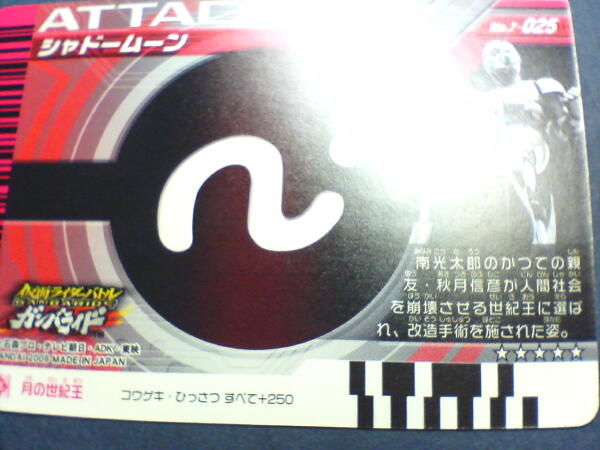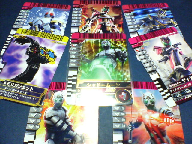 ふははははは!おれがしんのせいきおうだ! やったーシャドムンだー! 6弾たしかLR出ないまま終わったような……もちろん7弾初LR。 実は今日一発目でこれ出ちゃって「うおーっ」(訳:もう止めときたい)と思ったんだけど、 ついつい何回もやっちゃって……いや珍しくカード複数ペア持って出たものでorz (やった店は最近ずっとやってたセガ系、「じゃない」ほうね<割と引きがイイ方) 秘密も何もカードの枚数で判るって。 もうさすがにダブリの方が多いです。真ん中の段3枚以外ダブリ。 つーかシャドムンがLR、R、Nと全部でたんじゃないかな? あ、ちがった7-028がシャドムン唯一のNだった。今日出たのはR×2。 にしても影月率高すぎる。 順番的には、影月LR>雪山剣>DCDR>χ>影月a>DCDN>影月b>SPだったかな? R影月は絵柄も似ててどっちが先に出たか覚えてないや。 シャドムンも2回ほど使ったけど、後衛LR光太郎とかつけてみたけどイイ組み合わせでも無くて残念。 しかもその回必殺先に出されて死にかけたのを光太郎に「あきらめるな!」いわれて、 なんとか次ターンで必殺出せて勝ちしたしなー。 基本強いから必殺出すと3000ダメージとか行っちゃうけど。 今日の出札とは関係ないけど意外な発見で、 3-029のゼロノスゼロ(R)と5-010ディエンド(R)がベストパートナーなので燃えた。 あれ、勝ったっけ……?どうだっけ?(そこ記憶にないのかよ) 勝ったような気がするんだけど。 まー今日の戦績はぱっとしなくてExも一度しか行けず(しかもぼろ負け) 今日出たR-DCDに持っていたディエンド(上の奴)後衛につけてやったら 3rdゲキレツとって必殺出しても弱くて止めがさせず、次の4rdで返り討ちされ、 でも海東ごときにw「あきらめるな!」いわれ復活、 ファイナルまで持ち込んでスロ勝ちしまた必殺放つとかいうのもあった。 ゼクロス(N)とかももってって使ったけどオムツライダーはなんか地味だったわー。 後衛に6-022のG3-X(いちおR)のパンチコンビにしたけども、 ZXの必殺技「ドラゴンナックル」ワンアクションだしw かんけいないけど。 帰りにマックスバリュいったら「昆虫メカ」が半額だったんで、 買ってないアトラスカブト&タランチュラを一旦かごに入れたんだけど、 ……やっぱイラねーやと思ってやめたw かわりに超変形3のヒビキオンゲキコ半額を買った。(もちろん2個目) 前処分品見たけど買ったっけー?と不安だったけど帰宅して確かめたら持ってなかった。 そのときに一個買いそびれた記憶があったのがコレだったみたい(でも同じ店だったりする) いやもちろん組み立てたのは持ってますよ? PR Designed by まめの (Customized by Lost R) Copyright © [ るまぶろげーとZ ] All Rights Reserved. http://ruma.blog.shinobi.jp/ |