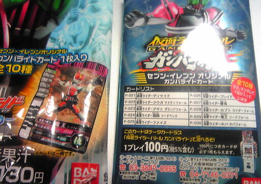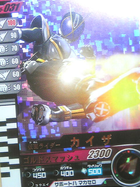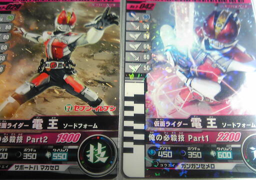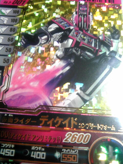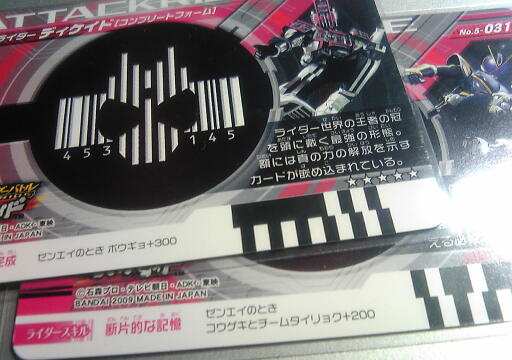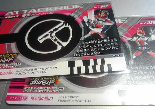 かんびじゃないよかんみだよ。 がんばらいどこうしきにも甘味処あるからね!(<あっち和風だろ) いつもはトイズ&ガチャカテゴリだけど今回はショクガンカテ。 ショクガンバラ~~~イド!!ってことだ! (追記:後に他ガンバラ記事に合わせてカテ変更しました) セブンなんちゃらいうコンビニで仮面ライダーアイス(ディケイドアイスではないらしい)でてた。130円売りでガンバラカード全10種から1枚封入。(小袋入り同梱) アイスとしては品質の割りに高いけど、ガンバラ+30円でアイス付と考えれば腹も立たないかな? ディケイドのカラーに合わせてスイカバーだったらよかったのになーーー。とか思った。 小袋に入ってるとはいえ外で開けるとかーどよごしそうなのでおうちにかえってあけましたまる おれさんじょうぽーずのでんおうそーどふぉーむでしたまる どこかでみたようなきがするなぁとおもったらてん あいすのぱっけーじにみほんとしてのってましたおーあーるぜっと すうちみてみたらさんだんの023とおなじですきるもおなじみたいだからてん きっとぜんぶ3だんのさいろくかーどですねまる 追記:あーでも3弾ではまだ全主役勢揃ってなかったから4弾からも再録必然なのか。 ……読みづらそうなのでやめた。 その後普通のガンバライドをやりにいった!出来心で! はじめに出たのは電王ソードRだったけどこの段階ではアイスおまけを開けてないので、 ソード連続だとは夢にも思っていなかったけど……、 なんと4&5混合台で5弾のR>SR>LRと立て続けに!(どういう配列じゃ) 調子乗ってもう2コインしたら4弾Nの持ってるのばっかりでたorz 最高の状態から欲を掻いても実りあるわけもないと後で悟ったが時既にお寿司。 まーそれでも初コンプフォームがLRとは!自分でもびっくりだ! ちなみに前回触れかけてみたコンプフォーム用新システム(コンプリートスキャン)やってみたら、 カードいっぱい持ってたけど即座に出せるわけもなく4枚くらいしか読ませられずorz よほど準備しておいてやんないといっぱいよませらんねーよ! ちなみに勝負には負けた!今日は2回CPU戦して2敗! そして、「ウチではじめてのカイザという解釈でいいのかな?」 4弾でSR,Rと2種有ったらしいけど見た気がしない。 今回もSRという優遇っぷりだけど、なんと4段はコウエイ向きだったのに 5弾のSRはゼンエイスキルつき!向上してんじゃん?! コンプフォームはさすがにゼンエイスキルでしたけどね。……なんか地味。 そういえばR電ソードは必殺技が「俺の必殺技Part1」でした。1は初めて収録? 電ソードにしちゃ珍しく速属性だし。 邪巣狐の中のひとにLRゲットの報告メールしたら 「(LR2種+SR1種も出たなら)もう5弾卒業だねおめでとう!」って返事きた……。 まだ稼動して5日だってのに!総額1000円ちょいだってのに!(5弾だけなら900円) ……フッ、それもいいかな。 PR Designed by まめの (Customized by Lost R) Copyright © [ るまぶろげーとZ ] All Rights Reserved. http://ruma.blog.shinobi.jp/ |