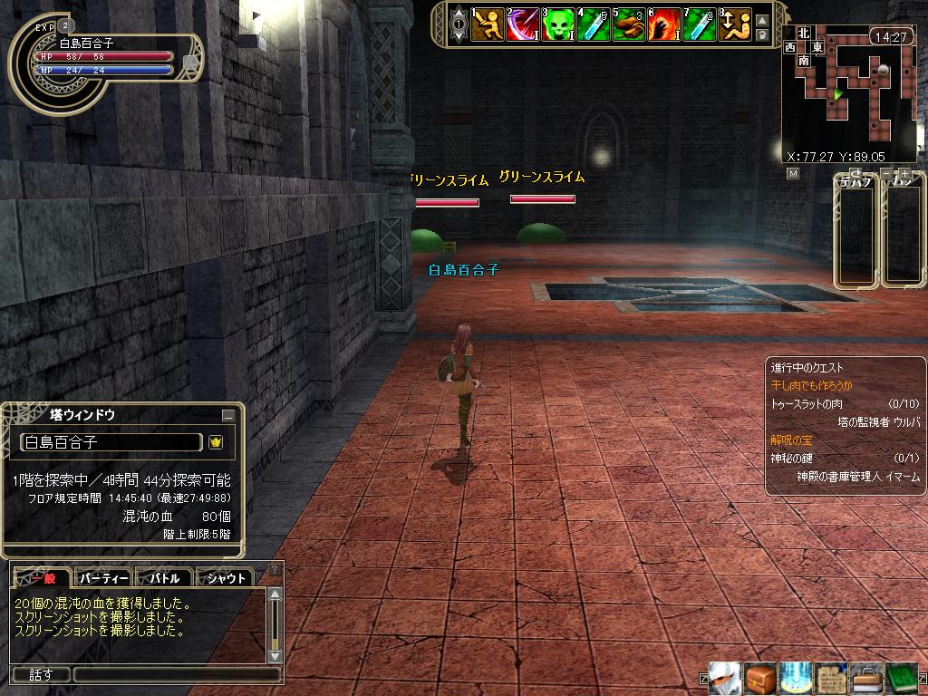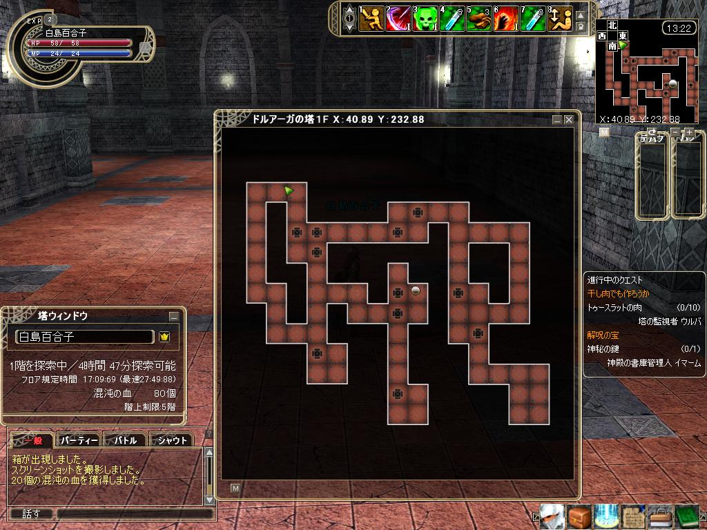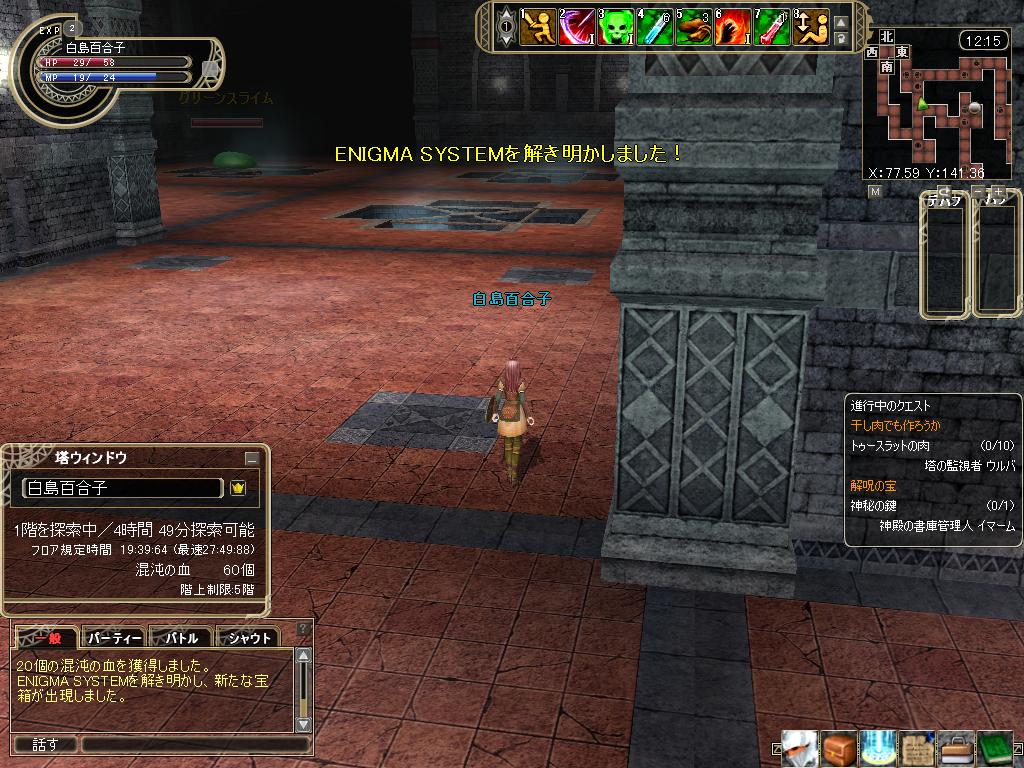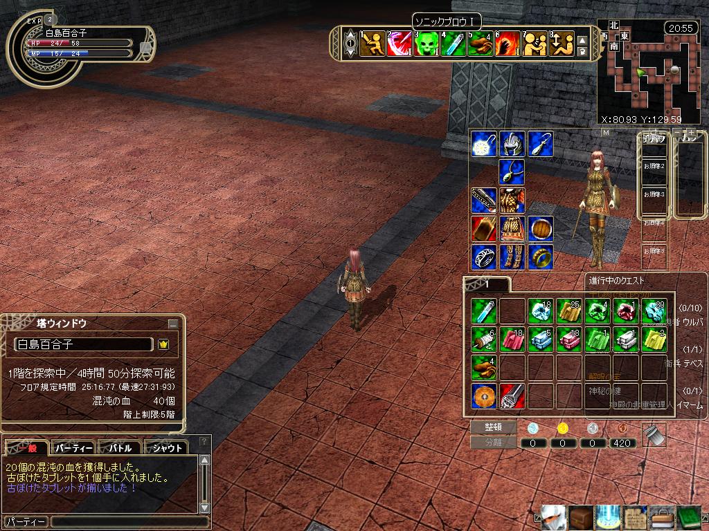 スライムは複数形がないような気もするけどまーいーか。 (ウィザードリーにも粘菌みたいなスライム出た気がするけど複数扱いはあったかなー?) てかのんきだなー家畜。 そと普通に畑とかあるんだけど。農家こんな乱世によく作業やれてるな。 (確かにモンスター駆除の依頼とかもあるんだけどキリが無いし) じつは“ファーマー”職が一番強いんじゃね!?実装希望! 別にお百姓になってませんよ。 スカウトのまま!遠距離スキルなんかくれ! と、ともあれせっかくだからあたしは塔へ入るぜ!一人だけで! これが塔1Fマップ。固定みたい。現在地は緑ですが出発点は下側中央。 とりあえず一番かんたんな任務を遂行! スタート地点すぐ北の白丸(マップ中央)が怪しいね!(NPCとかが居る印) 目的の岩にタッチ!メッセージ確認!任務完了!そして惨殺さる! クエスト一覧一番上に“運命の岩”っての有るでしょ。これ次の画像ではもう消えてるから。 その後、別のクエストのため再挑戦。 ていうか今度はスライム倒さないといかんのよ。 (倒して“古ぼけたタブレット”を得る) ふふふ、戦闘中回復剤飲みまくって倒せるようになった!すげー浪費! 2匹目のスライム倒したらとれたーー!(メッセージ窓) これでまたいっぽやぼうにちかづいた!!!(野望って何だよ) 続けてだったとおもうけどさらにもう一匹倒すと、エニグマシステム解明! つまり元祖「ドルアーガの塔」1F でいう “緑スライム3匹倒して宝箱が出た”って事ですよお客さん! それはいいけど……宝箱どこよ。スライムどこ行っても2匹セットで居るんですけど。 各個撃破じゃないと無理だー。 箱めっけ!ここも2匹……なんとか一匹づつおびき出すよ。 とりあえず一匹倒して、もう一匹が離れた隙に箱にダッシュ!! ゲット:カッパーマトック!壊れ物注意! このあとのシラシマさんの命運はご想像にお任せします……。 なおマトックは使い方わかりませんが、塔から持って出れます。 2Fではジェットブーツに当る「フェザームーブ」(スキル書)が取れるそうな。 ……でもランダムゲットみたい……そりゃ大変だ~てか一人じゃなー。 バビリム城門。まだ今の状態ではこの先にはいけないようです。 とりあえず上記のようにまだドルアーガの塔には行く必要があるんだよね……orz つーことで塔探索のPT組みたいひと募集するよ!! って、ここ見てる奴ぁいねーけど! しかもうまい事ドルアーガなんてやってねー! PR Designed by まめの (Customized by Lost R) Copyright © [ るまぶろげーとZ ] All Rights Reserved. http://ruma.blog.shinobi.jp/ |