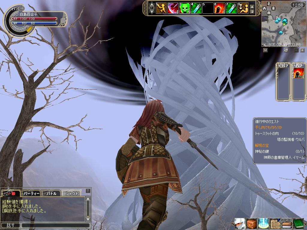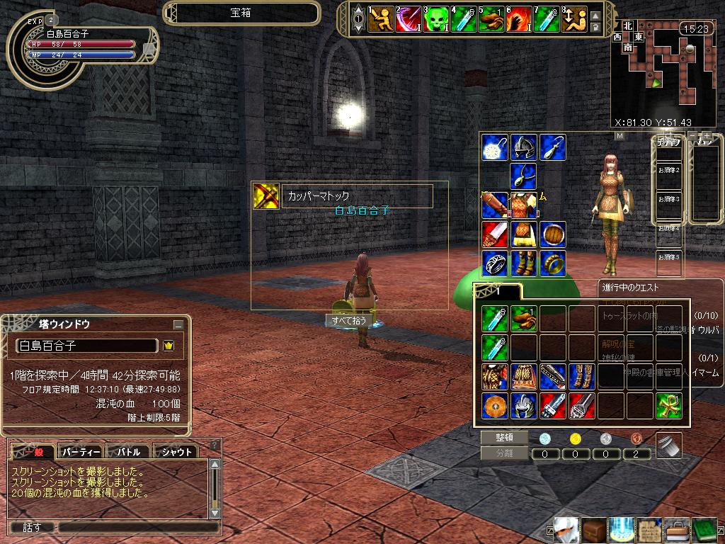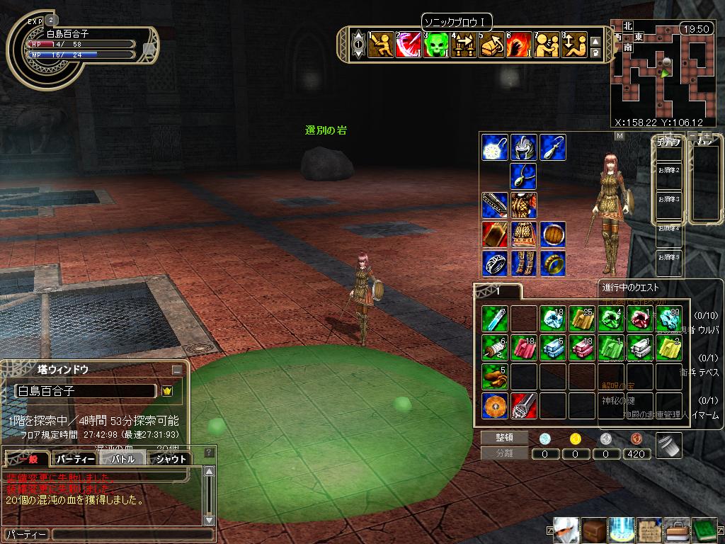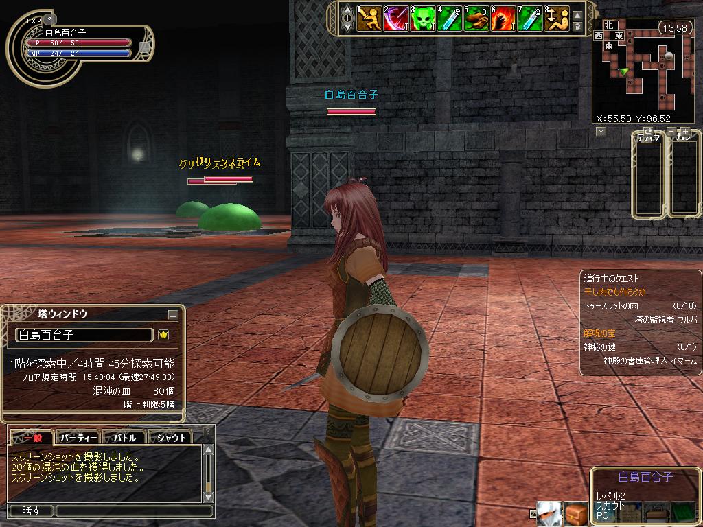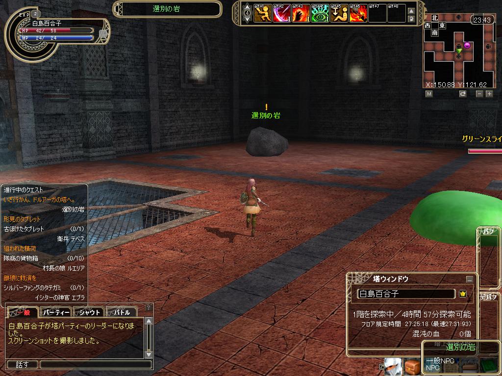 スライムは複数形がないような気もするけどまーいーか。 (ウィザードリーにも粘菌みたいなスライム出た気がするけど複数扱いはあったかなー?) てかのんきだなー家畜。 そと普通に畑とかあるんだけど。農家こんな乱世によく作業やれてるな。 (確かにモンスター駆除の依頼とかもあるんだけどキリが無いし) じつは“ファーマー”職が一番強いんじゃね!?実装希望! 別にお百姓になってませんよ。 スカウトのまま!遠距離スキルなんかくれ! と、ともあれせっかくだからあたしは塔へ入るぜ!一人だけで! これが塔1Fマップ。固定みたい。現在地は緑ですが出発点は下側中央。 とりあえず一番かんたんな任務を遂行! スタート地点すぐ北の白丸(マップ中央)が怪しいね!(NPCとかが居る印) 目的の岩にタッチ!メッセージ確認!任務完了!そして惨殺さる! クエスト一覧一番上に“運命の岩”っての有るでしょ。これ次の画像ではもう消えてるから。 その後、別のクエストのため再挑戦。 ていうか今度はスライム倒さないといかんのよ。 (倒して“古ぼけたタブレット”を得る) ふふふ、戦闘中回復剤飲みまくって倒せるようになった!すげー浪費! 2匹目のスライム倒したらとれたーー!(メッセージ窓) これでまたいっぽやぼうにちかづいた!!!(野望って何だよ) 続けてだったとおもうけどさらにもう一匹倒すと、エニグマシステム解明! つまり元祖「ドルアーガの塔」1F でいう “緑スライム3匹倒して宝箱が出た”って事ですよお客さん! それはいいけど……宝箱どこよ。スライムどこ行っても2匹セットで居るんですけど。 各個撃破じゃないと無理だー。 箱めっけ!ここも2匹……なんとか一匹づつおびき出すよ。 とりあえず一匹倒して、もう一匹が離れた隙に箱にダッシュ!! ゲット:カッパーマトック!壊れ物注意! このあとのシラシマさんの命運はご想像にお任せします……。 なおマトックは使い方わかりませんが、塔から持って出れます。 2Fではジェットブーツに当る「フェザームーブ」(スキル書)が取れるそうな。 ……でもランダムゲットみたい……そりゃ大変だ~てか一人じゃなー。 バビリム城門。まだ今の状態ではこの先にはいけないようです。 とりあえず上記のようにまだドルアーガの塔には行く必要があるんだよね……orz つーことで塔探索のPT組みたいひと募集するよ!! って、ここ見てる奴ぁいねーけど! しかもうまい事ドルアーガなんてやってねー! PR Designed by まめの (Customized by Lost R) Copyright © [ るまぶろげーとZ ] All Rights Reserved. http://ruma.blog.shinobi.jp/ |