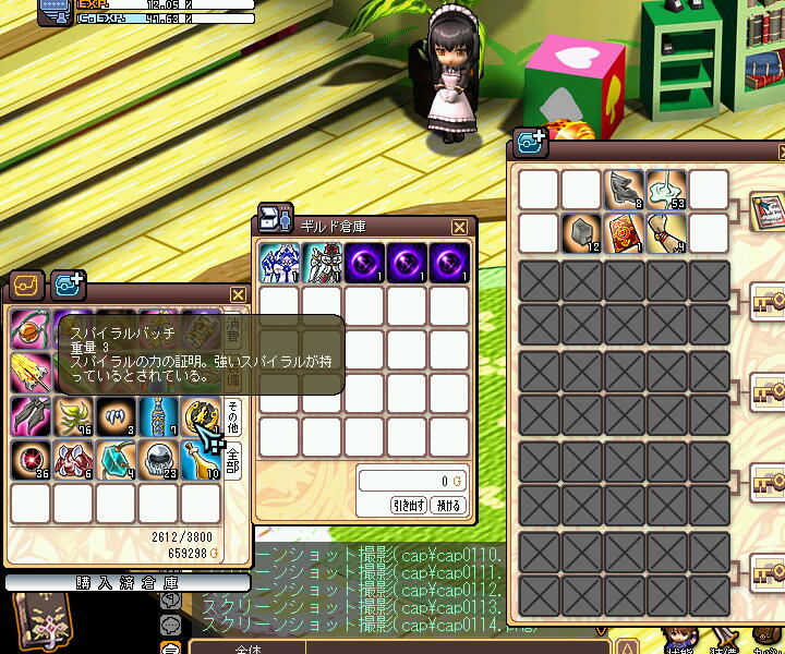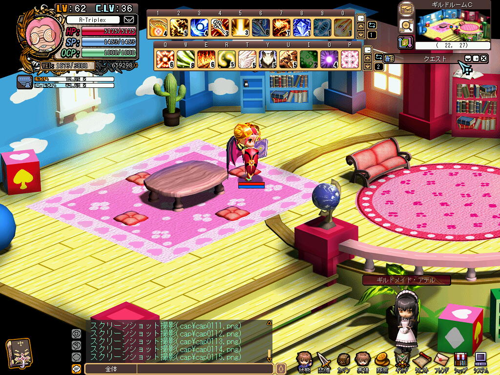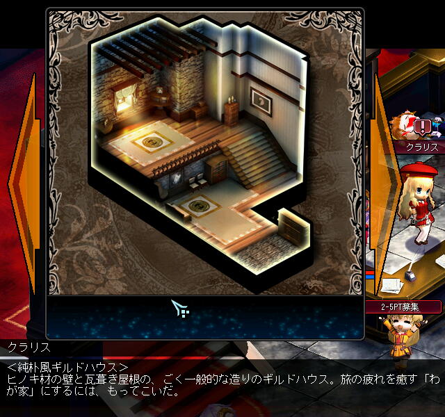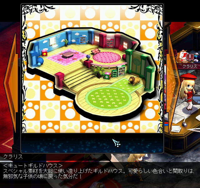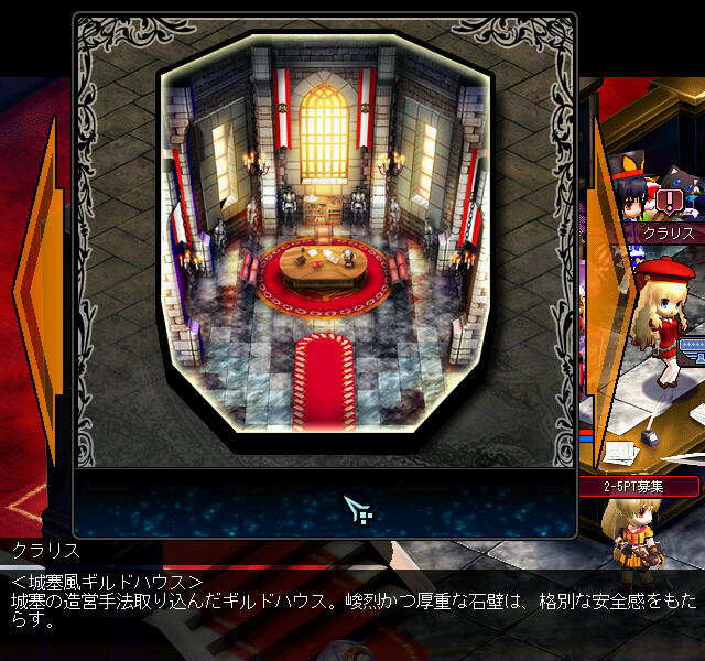 | ギルドポイントはドロップアイテムをほぼ10個単位で納品して貢献度を上げる形式。 一番高いのでも125pとかしか入らない。 たとえばPSOBBのは使わないスペシャルウエポンとかを納品する形式だったけど、 このルシエルのばあいは他であんまり役に立たないものがほとんどなので、 手持ちアイテム枠&重量限界の関係でわりとその場で捨ててしまいそうなものも多く、 ギルド貢献しよう!って意識しないと貯まらない。 ましてや一人で貯めるのはきついw しかし一人ギルドでもメリットはある。ひとつがこれ。 ギルド員共有倉庫(受け渡し用?)があるので一人なら増設ロッカーに! これは更に貢献度上げてギルドレベルを上げると枠がふえてくらしい。 (まーでも1万貯めるのきつかったし次あと2万なのでLv3も無理w) ちなみに拡張インベントリ(右の縦長枠)も露店で一口だけ40万くらいで買えたので利用してる。 (また欲しいけど今出てるの見ても50マンくらいなのでなかなか……) そういえばスキーリエキス(職別のスキル振り分けやり直せる薬)露店で買えた話は書いたっけどうだっけ。 なおルーム内装は3種から選択可能。 ついでにギルド部屋付きのメイド・執事も男女各2の計4人から選択可。 (メイドの一人だけ選択時と実際出るのでは顔が違ってるらしいけど選ばなかった) で選んだ部屋がこれ。 床面積一番広いんじゃね?……一人だけど。 この画面下の2つの転送マークがメリットその2。 2つある連盟都市の間をショートカットできるワープがあること。 これで間のだらだら長い雑魚街道を歩かなくてすむw (システム上に転送サービスもあるけど1000Gもとられる) そういえばギルドのレベルが上がるとこうやって鯖内にアナウンスされる。(顔つき) この恥ずかしいクルルもどき顔を流してやったわー!あーっはっはっは! あ、ギルドフラッグはこんなんです。(見づらいので黒枠入れた) 実際これより小さく表示なのでもうゲーム中じゃ字は読めませんw おまけで、ほんとはメンテ後くらいに上げたかったキャプ群の中からセレクトの一枚。 ……焼肉食べてえーーーー。こんな家焼いてもいいから食べてえー。 PR Designed by まめの (Customized by Lost R) Copyright © [ るまぶろげーとZ ] All Rights Reserved. http://ruma.blog.shinobi.jp/ |