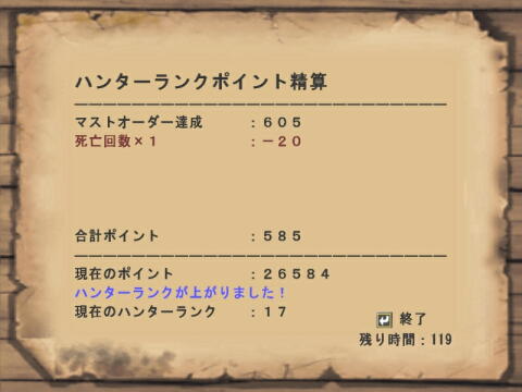 昼12時メンテ入り前にぎりぎりHRポイントが上がらなくなるまでになって、 いよいよ公式昇級試験?を受けなければならないことに。 ……いやHR16になってすぐ受けて敗北してんですけどね。 そのときは万全の準備したつもりだったけど自死がなかったまでも、 ターゲットの雪猿さんがダメージ蓄積により足を引きずる時点でタイムアップ。 まさに雪辱戦な訳で。ちなみにレイアはまだ倒せてません。_| ̄|○ フルフルも2回くらい挑戦したけど倒せてないなぁ。 こっちが死ぬことはあんまり無い位に慣れてきたんだけどな……。時間が。 そうそうバサルモスなんてはじめて倒したのが時間切れと同時で。 同時だから成功になったか?と思いきや達成の字幕が出てないからダメみたい……_| ̄|○ でも報酬はないけどモンスター売却収入はしっかり入ってるという。 大きさの記録もちゃんと残りましたよ。 その後の挑戦では無事時間内に倒せましたけどねー。地道に巧くなってんのかな……。 (ものすごく低いレベルでの微上昇だということは重々承知ですので。) そんで16時、メンテ明けての約24時間だけ誰でも入れることになった実質β2最終夜。 ドドブランゴ再戦。さて今回の秘策は……罠!ウーーーWANNA!(F2か!) dos以降は討伐でも捕獲でもクリア、という大雑把なクエ仕様になってるみたいだから、 公式試験でもそれで良いんじゃね!?とおもい持ち込んでみました。 だって足引きずってからが逃げ回られて時間切れるんだもん。 ちなみにこれがフロンティアでの捕獲初挑戦だったり。 そして…… へへへっざまーみやがれですわよ!!! 尚前回時間切れた時は自死無かったのに今回無茶したのか一回死んでます_| ̄|○アハハ 武器を大剣からハンマーに変えたので逃げタイミングに慣れなかったのかもしれない? (でもハンマーのほうが断然使ってるんだけど。レイアの尻尾切為の大剣です。) そんでなんとかHR17になったとさ。 なおHRあがってすぐダイミョウザザミ?に立ち向かったらいいように遊ばれたので、 サブターゲットクリア(コブンヤドカリ8匹)でお茶を濁しました。 ってかねー、試験ドドブラ捕獲の前は密林ババコンガ(多分格下大猿)に 子分猿共々寄ってたかって惨殺されたんですけどね……。 まだまだ狩人坂を登り始めたばかりにも程があるんだからな!? PR Designed by まめの (Customized by Lost R) Copyright © [ るまぶろげーとZ ] All Rights Reserved. http://ruma.blog.shinobi.jp/ |