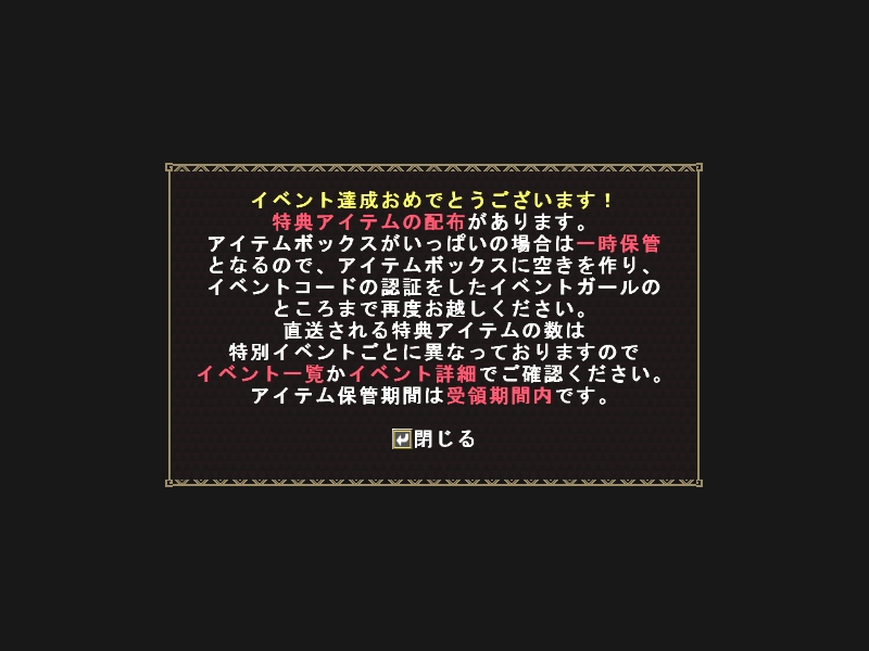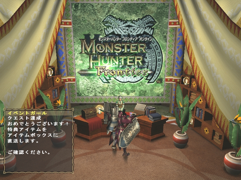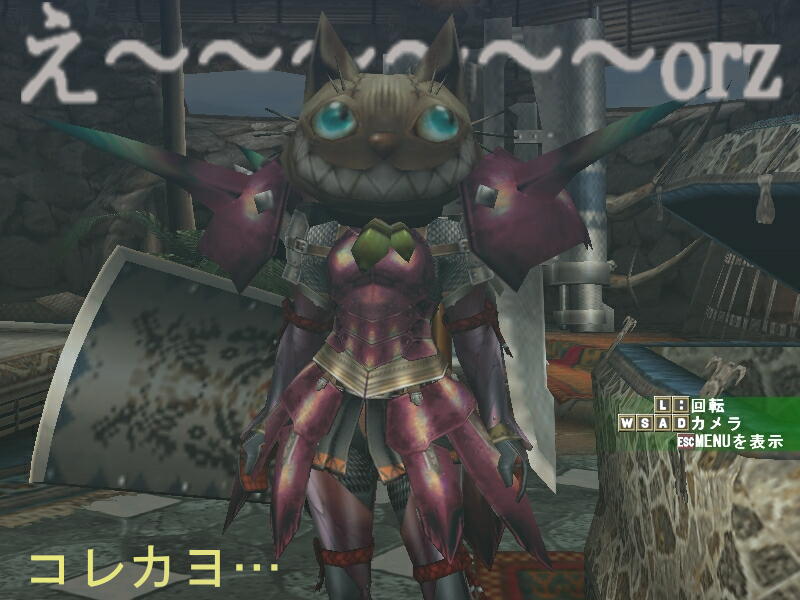 モンハンフロンティアクローズドβファイナル絶賛実施中!かどうか知りませんが、 個人的にはめんどくさくてあんまり行ってなかったんだけど。 (まぁ自分の腕的にソロの限界を感じ、またcβ後にはデータワイプが待ってるしね) ところがメルマガで「イベントやるよ!このコード入力したら装備アイテムあげるよ!」 って旨のお達しが来まして。ログインしました。 まぁ正確には1クエストこなすわけだけど。 もしつよーい飛竜討伐だったらどうしようあたし泣いちゃうから!とか思ってたら 特産キノコ×6クエ! It'sラクショーだった! 時間巻き戻ってはじめから~。手順的には街じゃなくて広場の所定のテントに行きます。 中はこんな風。 タイトルロゴのとこはイベントによってスポンサーロゴとか入れるんじゃないかな? 係のおネーちゃんにイベントコードを求められるので入力。メールからコピペ可。 承認判子ポン。 関連グッズとかパッケージとかのイベントコードクーポンもこんな手順になるようです。 βテスト参加者にはクローズドとオープンそれぞれでレッドベータ・ブルーベータとか言う 片手剣が正式運用後にプレゼントされる予定ですがそれもこんな手順でしょうね。 なおレッドとブルー両方のコードがあると双剣ツインベータとか言うのももらえるとか。 まーそんでキノコ採り行って来ました。 あ、クエは昇級試験のようにギルドマスターの爺から受けます。 またテントに行く。ここでくれるんじゃなくてハウスの道具箱直送かよ! 武具工房みたいに選択式にしてくれたらいいのに。この時点ではまだ中身不明。 で、入ってたのは…… ちなみにランダムで数種類あったのによりによって武器じゃない奴に当たりました。 ……ピンクフリルパラソルが良かったよう……ガンナー全然やってないけどw (一応虫ガンナー装備なら無いでもない<ピンク似合わん) しかたないので他防具を頭が目立つものに変えて武器も猫手剣装備にしてみました。 (なおクエには出てません。そのままログアウトw) PR Designed by まめの (Customized by Lost R) Copyright © [ るまぶろげーとZ ] All Rights Reserved. http://ruma.blog.shinobi.jp/ |