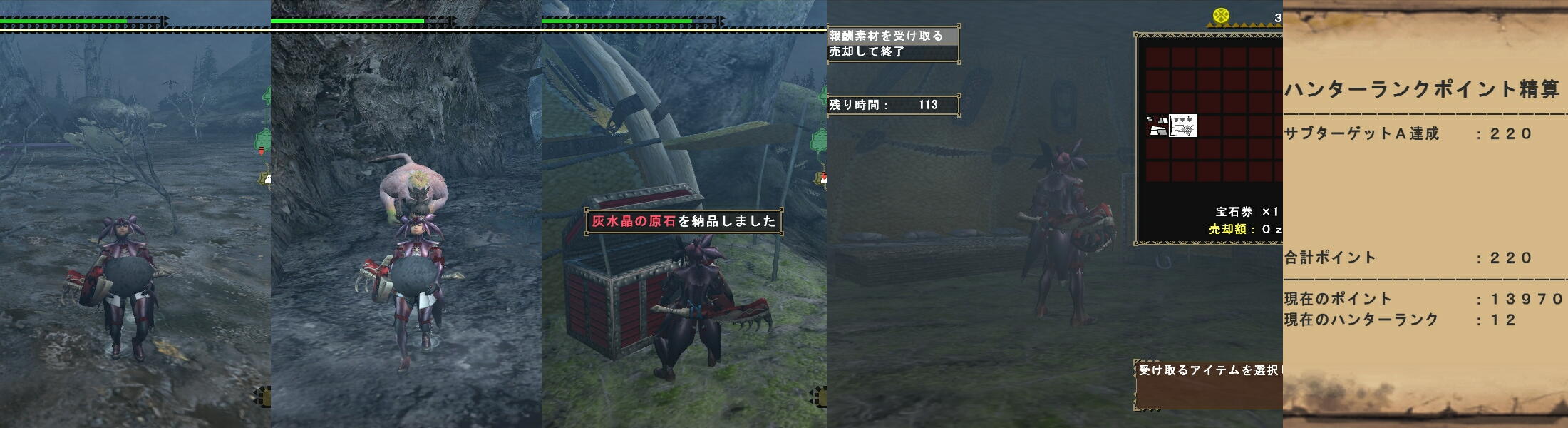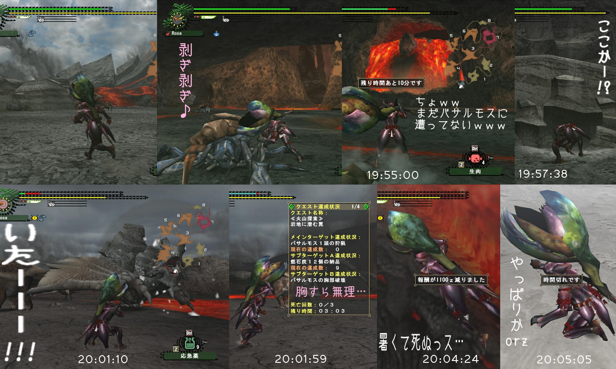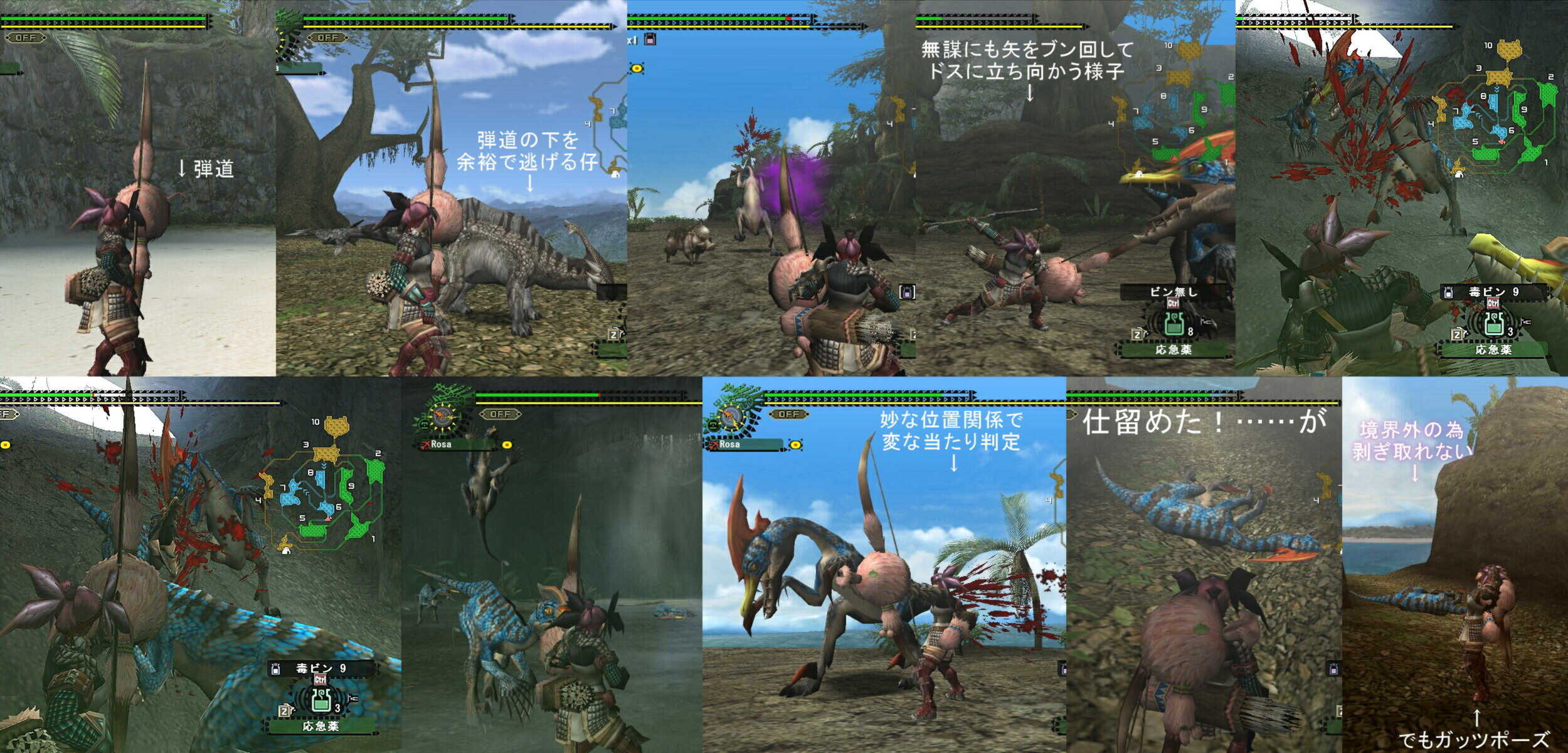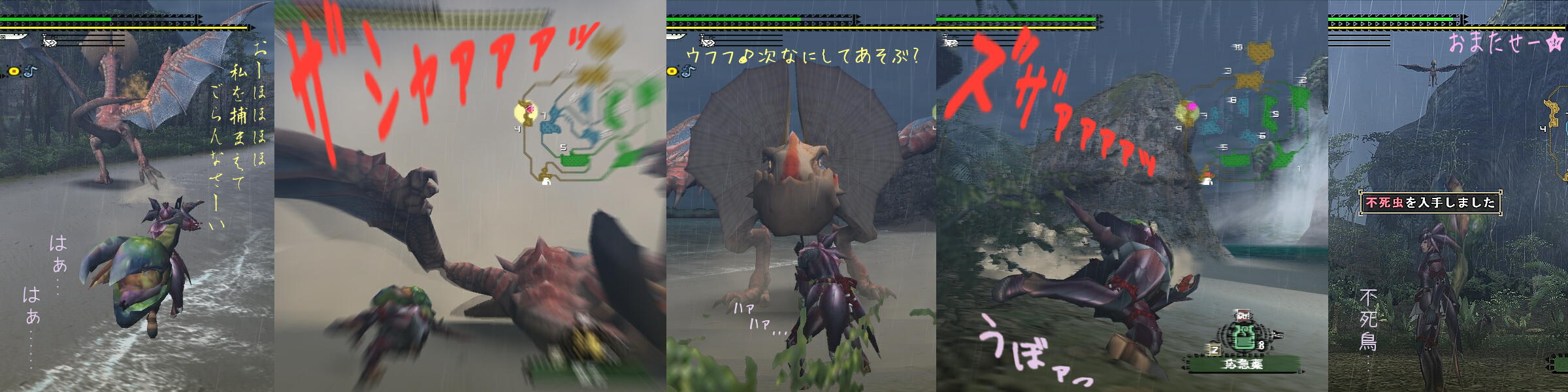 生焼けなのは強走薬作るためにわざと連続してやいてんだからね!ほんとに!つーことでまーラストつっても2週間ですぐcβ2なんですけどね。 えーと今回は14日夜から15日未明あたりの記録です。 ベータって意外と本番よりもワクワクしてたりするし、 あちこちで感傷的な声も聞かれました、……が。 あたしゃーほとんどソロだから何も感慨はねーよ!!!!チキショーメ! ……だって他人とやると足手まといになるからさぁ~。 時間的期限のある時にそんなのと一緒にやってらんないべ? そういうことで運搬クエも一人でやってやるぜ!泣かないぞ!? 前回の経験が役に立って無駄も少なくスムーズに終わりました。 ……スムーズに終わるとネタとして書くことねーよ!!!!(えーーーー) そ、そう!下手糞なのはネタを生み出すためなのですよ!!! さすがにネタで人に迷惑かけづらいから一人でやって……ぐすん。(つω;) そんなあたしの過激な遊び相手はククタン。(癒し系はドスファンゴさん。) まーそんなに倒してません。なぜかって?油断するとキャンプ送りになってるから! (油断してなくてもやられてるだろ?とか陰口たたく奴は耳元で音爆弾の刑<死ぬ!) 終わる前にやってなかったことやろうキャンペーンその1、 火山行ってバサルモスに会おうツアー。 いや、真面目に探したよ?MHG以前だとキャンプ近くの非高熱地帯に居たし……。 しかし全然いなくて。あっついとこ掘って回ってたらピッケル尽きて山頂で使えないし。 結局燃石炭足りなくてサブ達成不可能で、クーラードリンクも切れるし。 時間こんな風で山頂近くの行ったら隅っこにバサル岩あるじゃない!? 結局時間ないわあっついわで一死&タイムアウトーorz 胸殻なんて狙うどころか近くろくによれなかった。まーどっちにしろ無理。 終わる前にやってなかったことやろうキャンペーンその2、弓の使用。 ボウガン(L)は毒で殺虫するためちょっとやったけど。 一応作ってたけどつかってなかったんで。使ってみた。 でもよくわかんないwビンって何?毒とか蓄積させれば効くの?全然効かないけど……。 それでも強引にドスを倒しました……ら、なんか変なトコに屍骸が……。 久々に虚しい思いをしましたよ。 クックのときに話に出た、癒し系・ドスファンゴさんは こっちにその気もないのに早々とオネンネしてくれたりします。ってか早いよ!! ドスファンゴ体力へっても逃げ足遅いんだもんw ポポ(鼻なしマンモスみたいなの)8頭のサブこなそうと思ってたのになー。 では続きはまた。 PR Designed by まめの (Customized by Lost R) Copyright © [ るまぶろげーとZ ] All Rights Reserved. http://ruma.blog.shinobi.jp/ |