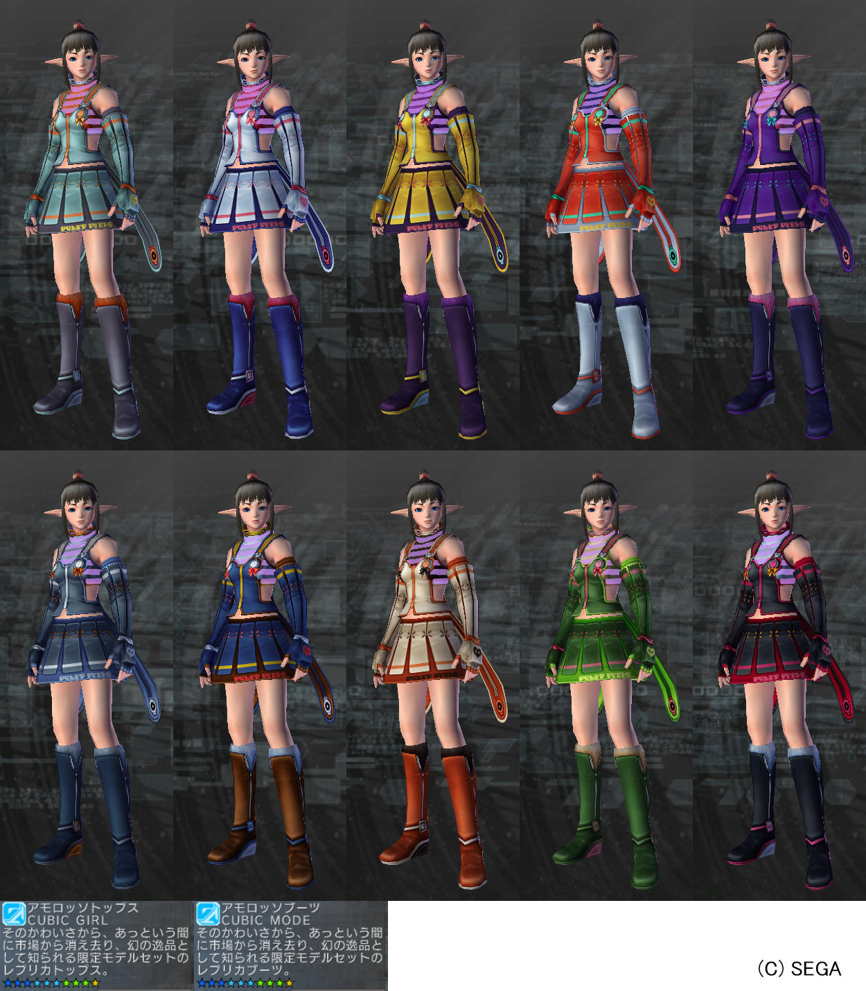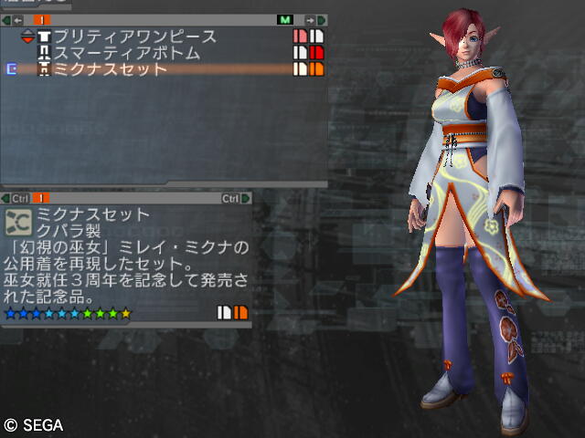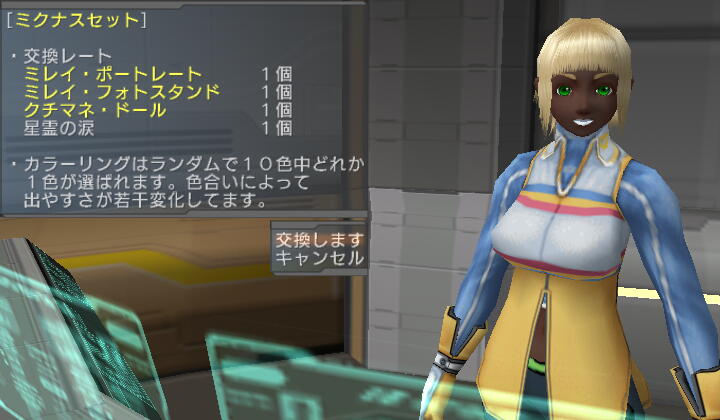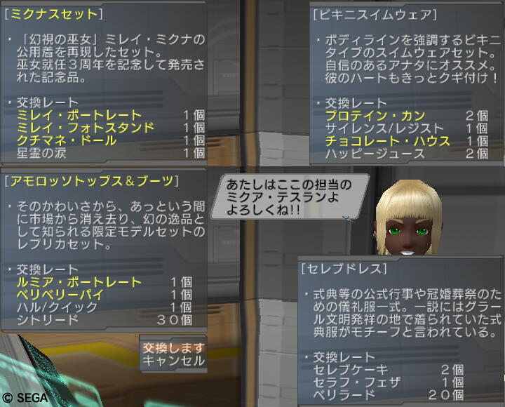 えー、イヤよイヤよも好きの内などと申しますが、 あんまりやる気無いけども課金しちゃってライセンス有効期間中は一応やらないと。 PSOBB(sega)の3日も一日しかつないで無いまま過ぎ去ったしね。 PSOBB(ハンゲ)のは道のり長すぎてやる気ねーしw(装備品移動したかったかなー?) そんなこんなでPSUですが、何とか新規配信の服2種を一着ずつだけど入手。 交換制なので集めるの厳しすぎてカラバリ全部とか無理……。 これはストーリーミッション第3章冒頭でルミア・ウェーバーがマヤ・シドウから 彼女の少女時代のお下がりで貰ってた古いガーディアンズスーツの色違い、 アモロッソトップス&ブーツ。(セットで交換してもらえる) 交換レートは……、 狭くてごめーんねw 水着とかドレスは過去限定品未取得者への救済措置。(旧作のだしイルミからの人自力で取れないから) 交換に要るポートレイトのため、 過去のストーリーミッションをB難度でS評価頂くためにやったんだけど、 これが意外とめんどい。まして要るものが全部act2の方由来だから道のりが長い!! 1回目は時間オーバー、2回目はアイテム枠いっぱいで貰えず(酷すぎるorz)、 3回目でやっともらえて、4回目予備に貰っとこうと思って2つ目ゲット。 その模様は画像もあんまり無いし面白くないから省略! で、交換。でも配色が良くわかんない。店だと試着できるのに~。 交換がミッション形式だから入れられなかったのだろうか?不自由なシステムだなー。 で、拾い物ですがアモロセット一覧で確認。それでも名前と実際がわかりづらいけど。 作成者さんどこのどなたか存じませぬがありがとう。 結局今のブルックの服の配色が好きなので近い感じの奴に。 貰ってるのは都合によりLostRですけど。先になんか貰っちゃってますけどw ブーツはドタッとしてるのでメイディにかえた。でもハイソックスが無いから残念。生脚生脚。 で、LostRが着てたほうは幻視の巫女ミレイ・ミクナの服のレプリカ、ミクナスセット。 色は巫女サマーと同じものは無いそうですが。でも選べないのよ!!運任せ! こうかんした! こんなんでましたけど!レア度的には中くらい? まーそう悪くないけど、地味っちゃー地味? こちら一覧は持ってませんけど、一時的に着せ替えサイトが作られてるみたい。 ※urlから末尾の2を抜くと男性服のほうが見れます。 これ、ベータのときに着替えシミュサイトとか作ってた同じ人製作なのかなぁ?(あたしもベータ時点の女子ヘア一覧で貢献してたのよ!じつは!) で、これ以外の色も欲しいんだけど、アイテム集めが厳しいから PC店に出されてるの買おうかなーと思って検索してみたけど、一番安いのでも140万とか! くじ式だから望みじゃない奴が出たら売られるせいか実はアモロッソよりは安いんだけど。 (アモロッソはトップスとブーツ別だから合計しちゃうといっそう高い) でも一番安いあたりの色はあんまり欲しくないかもー? これ常設交換だからそのうち安くなるかなぁ? PR Designed by まめの (Customized by Lost R) Copyright © [ るまぶろげーとZ ] All Rights Reserved. http://ruma.blog.shinobi.jp/ |