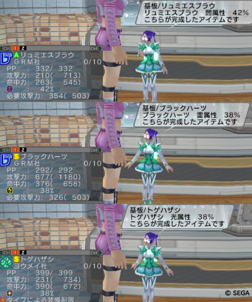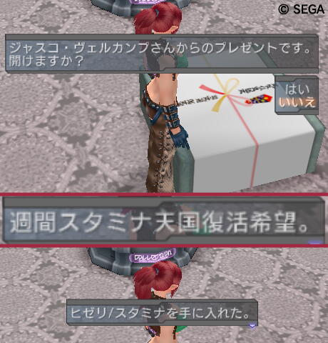 「俺より強いやつに遭いに行く」……すと2か! べつに黒い悪魔こと邪巣弧と対決しているわけではないです。 今日も今日とてぶちぶちきれますよ!回線が! パキパキ凍りますよ!PCが!ついでにUSBも言うこと聞きませんよ! 本当の敵はPCの中にいる!! (画像の)日付が遅れ気味というか進み気味なんだけど、 めんどくさいんだよー画像整理すんのもよー。 ある程度まとめて一枚にしたほうが無駄がないのもあるしさー。 その割にいい画像取れてない時とか、逆にいっぱいのせたいのある時とか。 そうそう、前回失敗して毘須虎さんご乱心だったキラーエリートですが、 その後再挑戦のチャンスが来てさすがに成功したそうです。 こんなんだって。あたしの初見感想としましては「がんだむっぽい!」でしたw なんかオーカワラっぽくね?勇者様タイプGの武器とか。(色は流石にこうクドくはないが) そういえばあたしがPC再起動してる待ち時間の間に、突然装甲お色直ししていた邪巣弧。 あんまり変える派ではないのでなんで?ときいたら 「おみくじに服を変えろって出た」と。……装甲は服なんですか? タイトルに書いてて忘れてしまいそうな生産話。 今回は3連続好属性(自分調べ)きたですよ! 自分的にはトゲハザシ高くなってほしかったけど、 Sグレード武器だと装備タイプ(職)制限おおくなるからAが高いほうがいいかな……。 リュミエスは大振りな形が好きだし。……ってか今、闇つかわねーよ! 銃器もまー無難に。Sだと%高いからね。属性も関係ないし……。 こっちがやってらんない状態なので一人さびしく(推定)まわってる邪巣弧が拾い物くれました。 これで少しでもメギ死を避けろということでしょうが、鎧が持久低いのかあんま変わりません! でもありがとう!大事に倉庫にしまいこんでおきますね!(嘘です使います) ……スタミナ天国ってなんだっけ? 今意味のない超星霊運、だって途中で落ちるからさ……。 リーダーやったら解散になるから人と一緒にもできないしさ。 そんでもぼちぼちやってみたよ。時間かかるわー。 頼みのNPCもあさっての方向へSUV。そういうときに限って威力のある効果。 さすがにこれくらい狭いと効果覿面ですが。久々見たなでぶ お、じーさんたまには狙いばっちりいってるやんけ! それでも頑張ったあげく3割くらい進んでダウン。 貴重なメギスフィア消費して見たことないるーむにモデルチェンジ! ……やっぱまえのがよかったわorz 地味だ地味ー! 基本置いてるものは配置が変わっただけです。 いじょうファクトリーレッドの様子でした。 いつかメギスフィア99ためてExユニット、ダークネスウイングもらうんだ……。 でもこのPCリセット地獄はどうにも抜けられない……orz PR Designed by まめの (Customized by Lost R) Copyright © [ るまぶろげーとZ ] All Rights Reserved. http://ruma.blog.shinobi.jp/ |