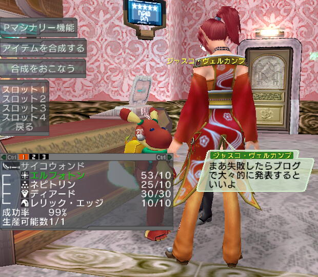 Lost:Rがひらめいた事はこの顔についてでした。解決になりません。 そんなことはまあいいとしてーーーー。 なんとなく、レアミ権利取得しちゃったりしたあの日。(かなり時差記録ぎみです) ソロでレアミいったんじゃ500%の経験や職Pもったいない、ってんで ツーか一人じゃ途中で落ちる恐れが大きいので、ケータイメールで邪巣弧を召還し、 例によってドウクツックにいってみたらいつも見ない鳥さんが居りました。何故? まー、だからって何も特筆するほどの出土品はありませんでした。 邪巣弧は落ちるものも違うみたいにいってたけど大した事は無い。うん。 邪巣弧が基板拾ったので製作を請け負ったセラフィセンバも何とか完成。 失敗しなかっただけありがたいが本人は属性にご不満の様子。まーねぇ……。 請負代金ってわけでもないが、サイコウォンド基板をくれまして、素材も提供してくれまして。 いちおう99%って事なので仕込んでみたけど、これで失敗した日にゃもう!! 『……お前を その後もいろんな困難におびえつつも、ハル/スマートとか出土。 まえ邪巣弧に回ったのいったんくれたけど、 速度上がるデメリットにテク射程カットってのがきつくて返したのだった。 一応これは自分でもっておこう。 さらにさらに。 なんか結構会うようになった気がするレアモン・ジゴブーマだけど、 とうとう!とうとう緑の以外のドロップ品が見えましたよ!? とうとう目的のものをゲットし大歓喜の邪巣弧。 しかし ほんとうの たたかいは これからだ! 『オレ、ミラ出たけどガルドねーし!』 ←こんな事言ってません、捏造しました。 じゃすこの ぼうけんは もう ちっとだけ つづくんじゃ。 とりあえずもう手に入らないガルドと交換もしくは購入資金繰りのために、 なんとかミラをもう一丁ゲットするつもりのようです。 メンテ後配信の“δ ”で配信される可能性も無い事は無いですが、 邪巣弧の見通し的には運営的にそれは無いだろうとw その数時間後、無事にサイコ杖も出来上がってました。 ガンテクターLv19.4くらいだったのだけどこれ装備するためにマスターフォースに転職! ……杖と魔導具しか装備できないんよ。Lv01からではガンテク19よりテク使いとして弱いしorz イベミッションγのソロやるのも弓が無いときっつい。 こんなとこからお邪魔します。 まーでもこの直後フリーズしたんですけどねorz……アイテム回収すら……。 珍しくLv60のキャス子、ラパン・ルージュもフォルガンでちょっと出動したり。 (尚このセラ・ヘブンリーちゃんも邪巣弧と同じ穴のムジナです。) などと、とりあえずだましだましでいろいろとやってみた水曜夜。 邪巣弧のお供でも運良くイベミソS21周を奇跡的に全行程行脚達成できたり。 (それまで何度途中で落とされたことか!) 何とか長時間生き延びられたので、 マリーナのウォーテク修行をちょっとしてみたい。と、 おみくじ引いてみたらチョー!これは!アレを狙うしか!!! そしたらなんとC一周目で……、 こ、こんな事ってほんとにあるんですね! これで寝なくても平気!(←間違ってる) (一応過去2つ発掘し、邪巣弧と分けて一個ずつ持ってますけど、複数あると便利だから……。) この数日はブチギレ混合で大変な思いをしたけど、これは嬉しい品です! ……これ今のイベミソγ開始直後だったらプチ成金だったのにw(売るんかい) ちなみにこの次周では何も出ず、3週目の途中でとうとう凍りつきました……orz 明日(まー書いてるのはもう木曜だけど)のメンテで開放されるイベミッション“δ”がどういうものかによりますね。 γで散々出たコンフューズ/レジストが必須になったりしてなー。 (でもこれは自力でアンチメイト食べれるから睡眠や凍結、麻痺ほどの恐怖は無いか) PR Designed by まめの (Customized by Lost R) Copyright © [ るまぶろげーとZ ] All Rights Reserved. http://ruma.blog.shinobi.jp/ |